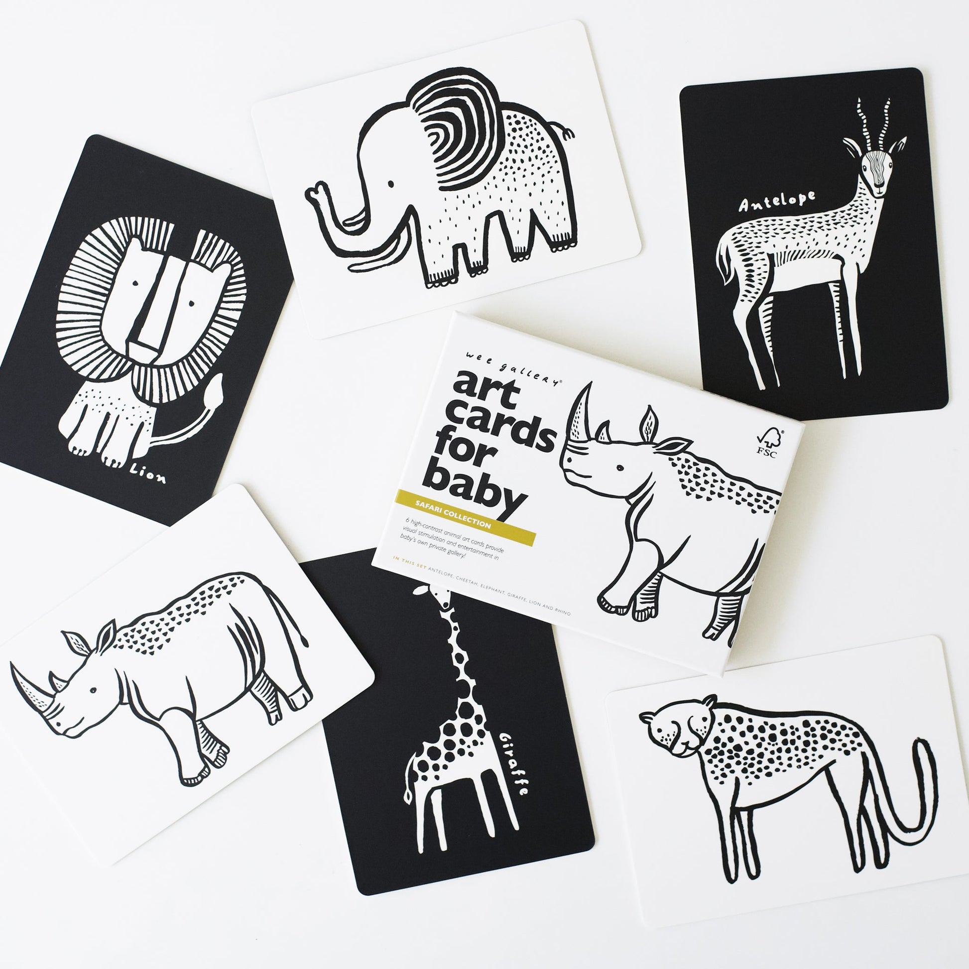 Babies are fascinated with black-and-white designs. Right from the start, these art cards begin developing a baby's visual perception. The six adorable animals in this set include an Antelope, Cheetah, Rhino, Lion, Giraffe, and Elephant. Printed on sturdy board book material, these cards will stand up to baby's explorations. Each 5"x7" card beautifully finished with matte lamination and child-friendly rounded corners.