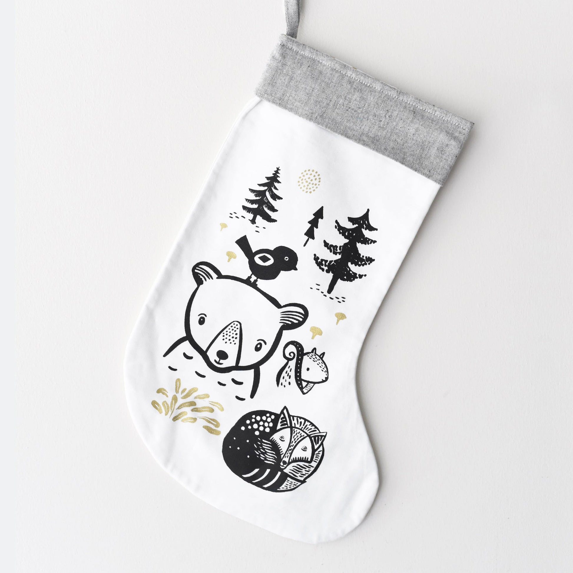 This Christmas stocking will give a touch of Wee Gallery to your family holiday season. Bear and friends printed in black on white 100% organic cotton twill with gold highlights. The inner layer of the stocking is printed with golden dots. Grey band at the top with sturdy loop for hanging. Made in India using ethical manufacturing practices.