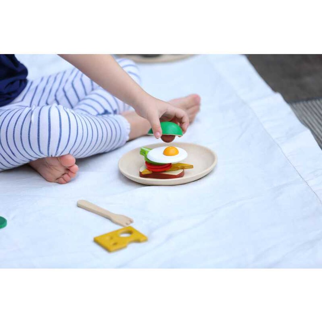 - This set includes a plate, silverware, slice of bread, half of an avocado, 2 leaves of baby spinach, a bacon strip, sunny-side-up egg, mushroom, slice of tomato and slice of cheese.