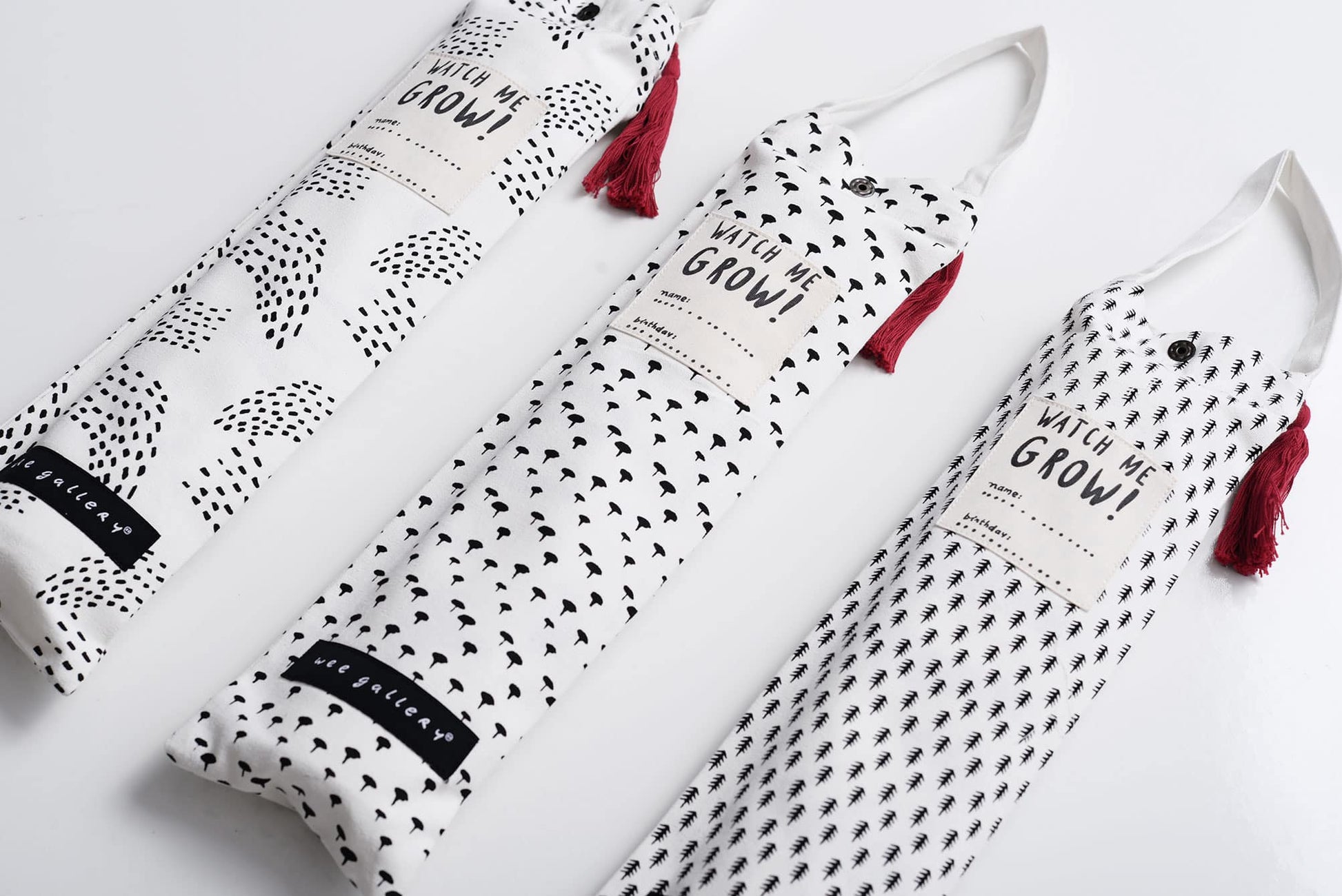 Ethically made in India using screen printing for quality, on GOTS Certified organic cotton canvas, finished with a waxed cotton twine hanging cord and stylish fringe end. Comes in a special keepsake storage bag with a place for your child's name and birth date. The most eco friendly gifts are the ones that are kept, and this measuring chart is made to be loved and to last.