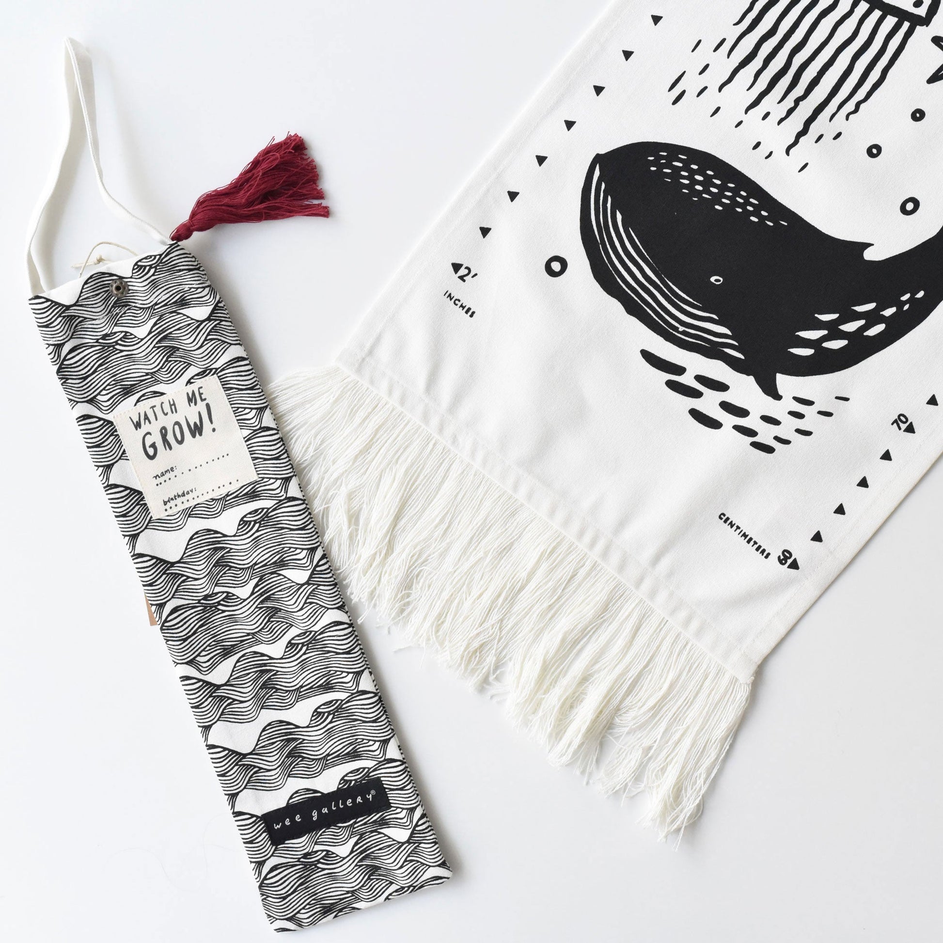 This growth chart features sweet ocean animals that will keep you smiling as your little one grows. Ethically and sustainably made in India using screen printing on organic cotton canvas, finished with a waxed cotton twine hanging cord and stylish fringe end. Comes in a special keepsake bag with a place for your child's name and birth date.