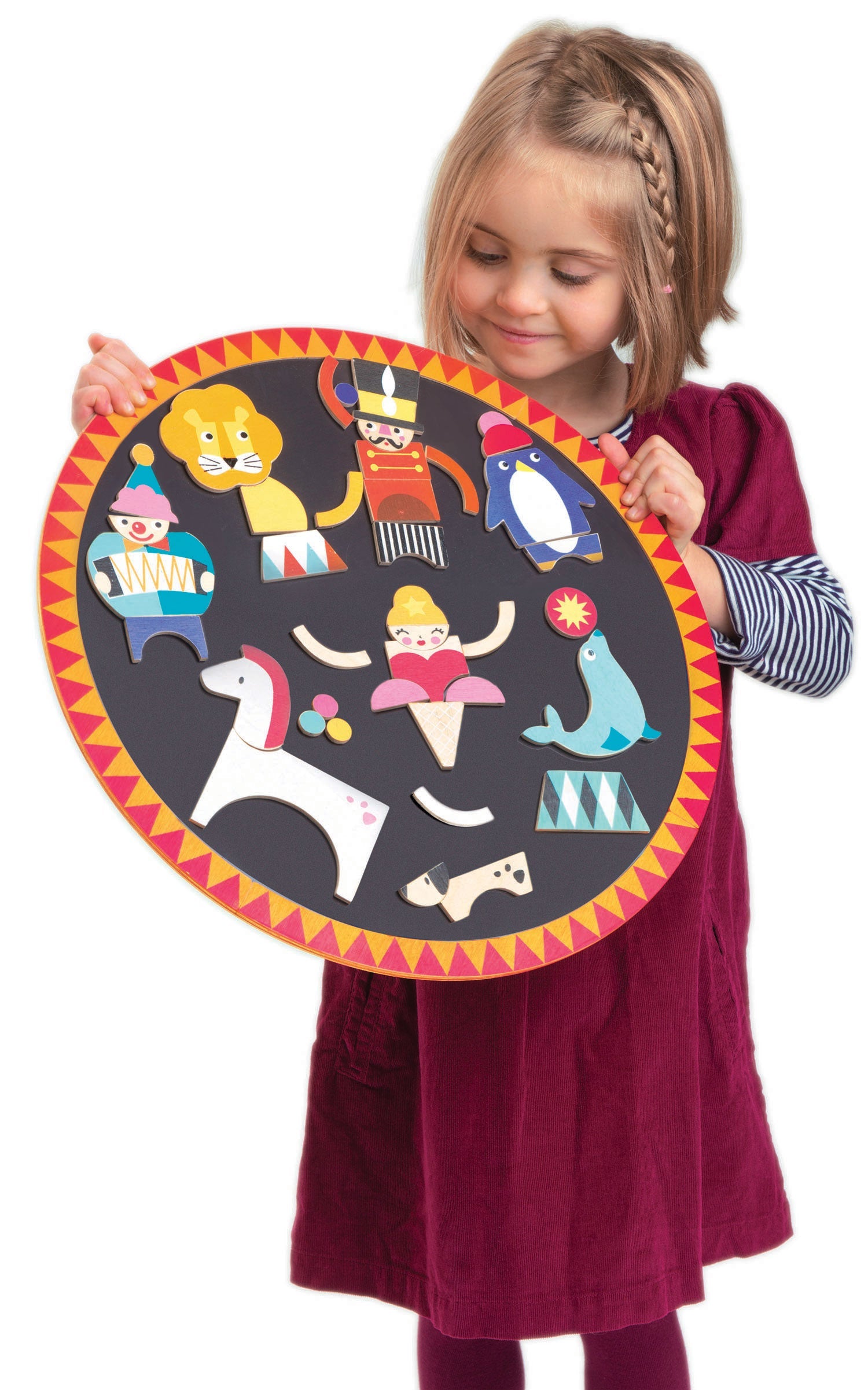 Welcome to the circus night! Create your own wacky circus troupe using 37 wooden magnetized pieces on a circular board to make as many circus characters as you can. The board can be hung up on a wall using an small bracket on the reverse.