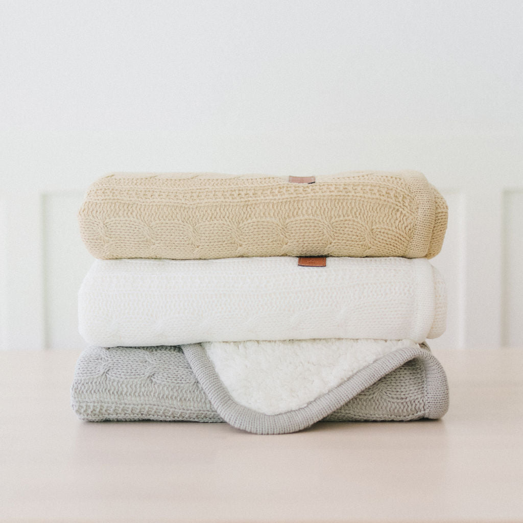 Two classic textures – classic cable knit and sherpa – come together in one ultra warm and cozy stroller blanket. On one side, plush fibers are knit into repeating cables, offering all the irresistible appeal of a favorite sweater. On the back, soft cozy sherpa reminds you of cozy fleece.