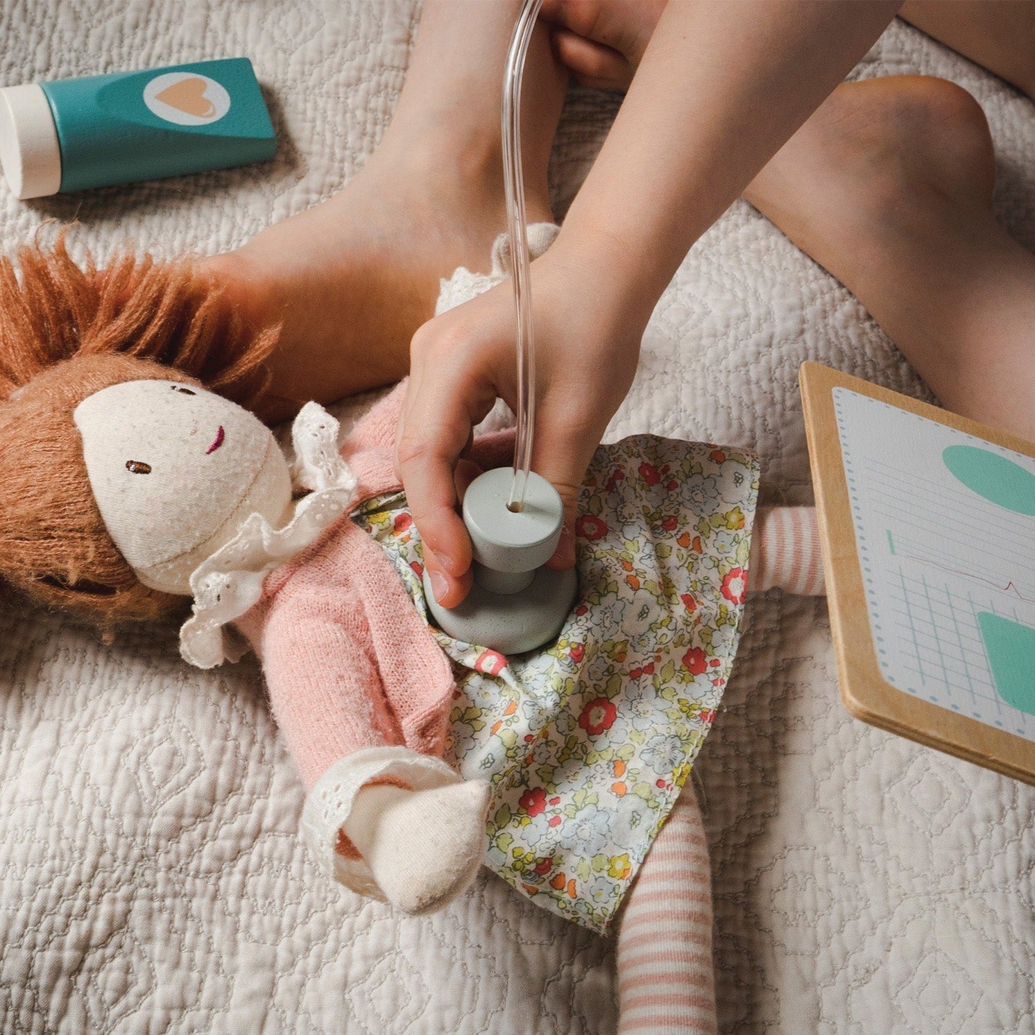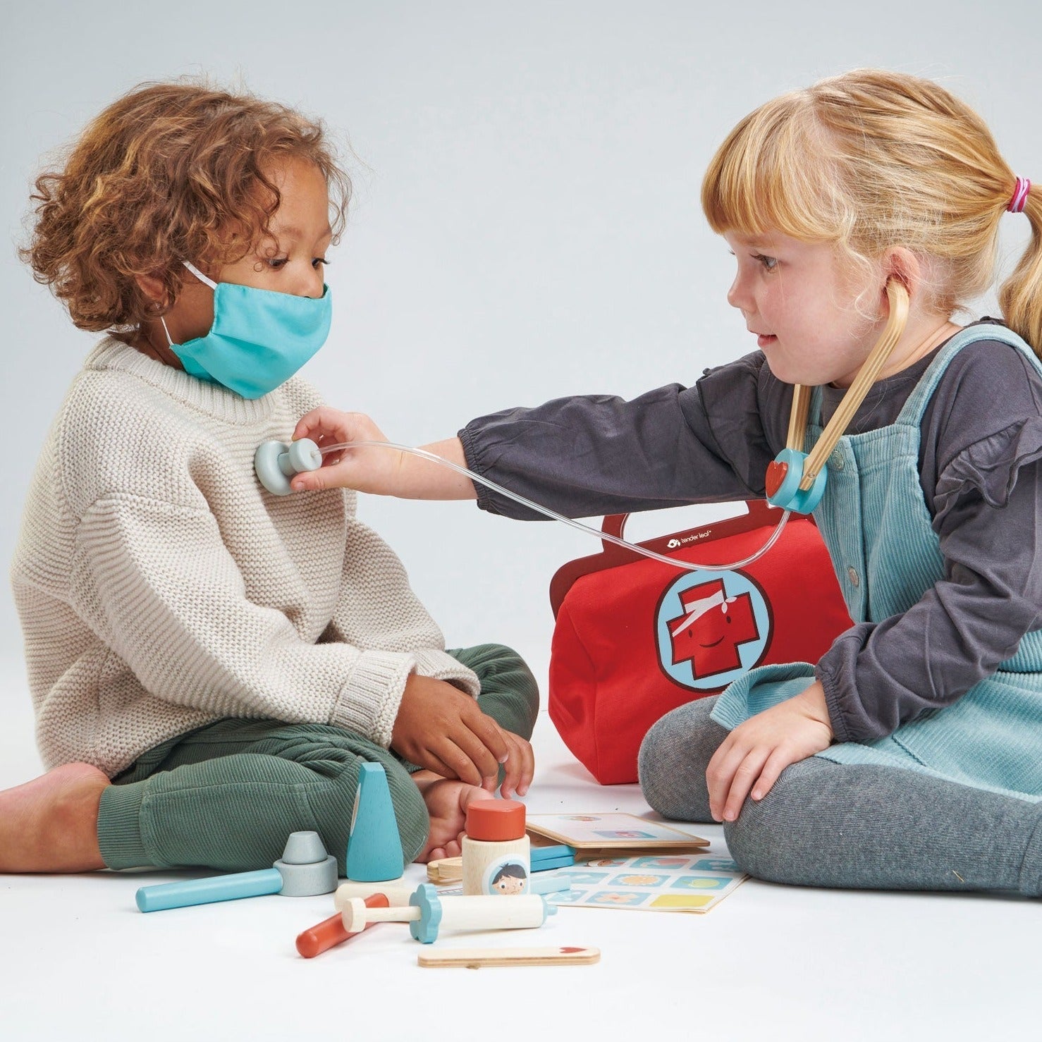 A retro-styled canvas and wood doctor's bag full of all the essentials for treating poorly patients. Set includes: a stethoscope, scissors, an ear probe, a syringe, a doctors knee hammer, a blood pressure monitor, a cloth mask, plasters, stickers showing ailments and remedies, a clipboard, a thermometer, a flat stick, a bottle of pills and a tube of ointment.