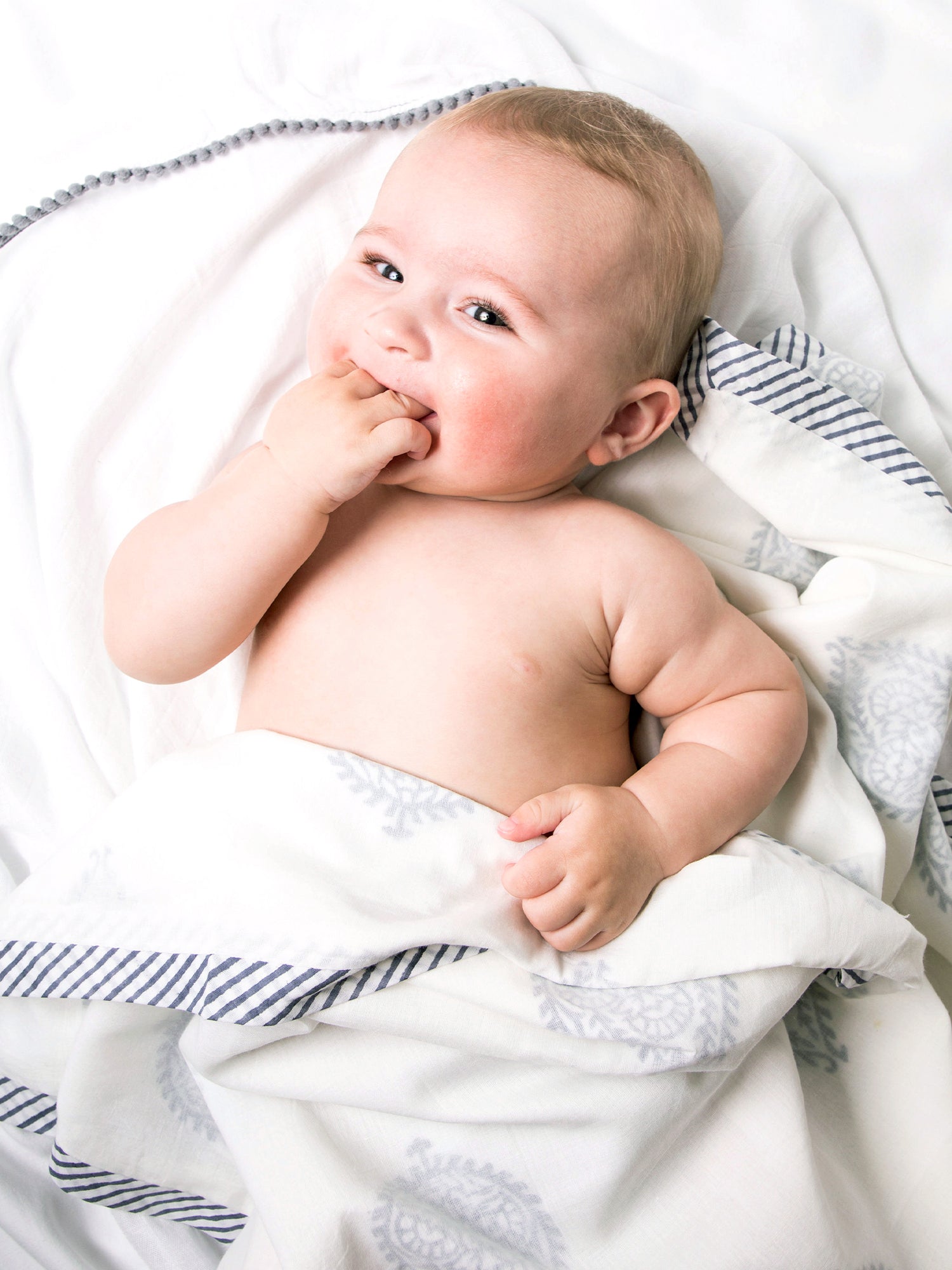 Three layers of soft natural cotton sewn together to bring the utmost softness and breathability to your baby’s blanket collection. Features a hand block-printed center layer with natural delicate cotton voile outer layers. Convenient size and lightweight fabric make cuddle time lots of fun at home or on the go!