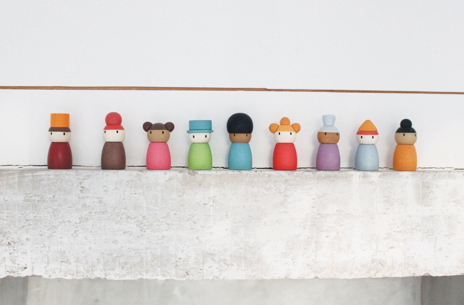 Part of our open-ended play, meet the 9 folks who reside at the happy hotel. Made from solid wood, colored with a soft water based stain, they can represent anyone you know. These little people are perfect for adding to any sort of creative or imaginative play, and can be perched easily on any surface.