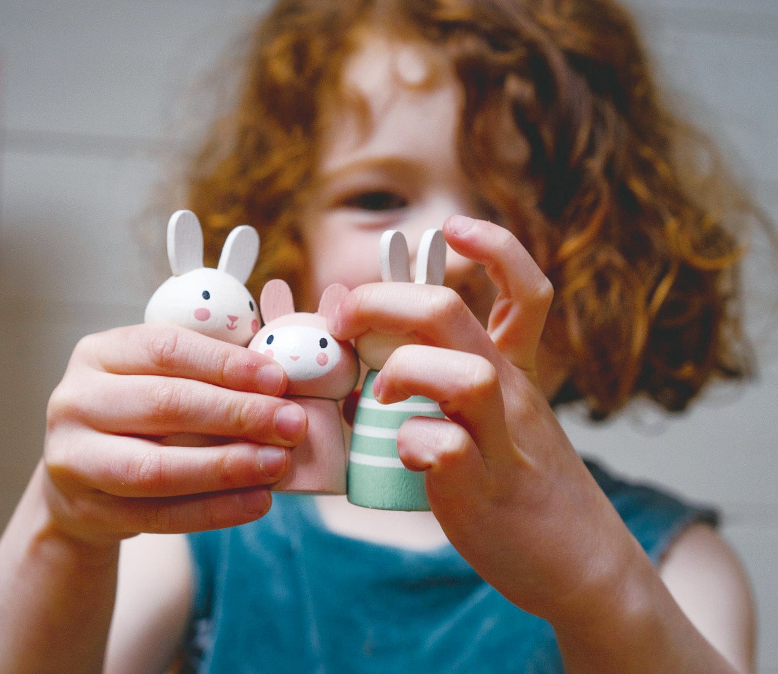 A perfect solid bunny family with Dotty the mum, Benny the dad and Pip the baby, all finished in stylish colors and ready to add to any dolls house set or open-ended play set.