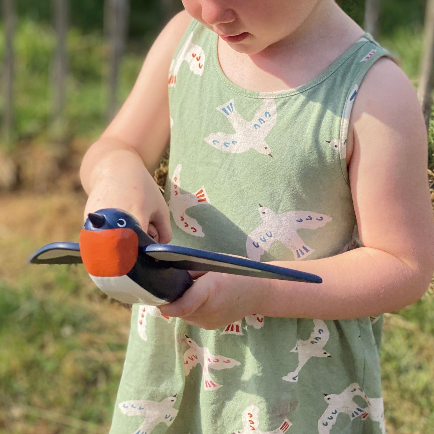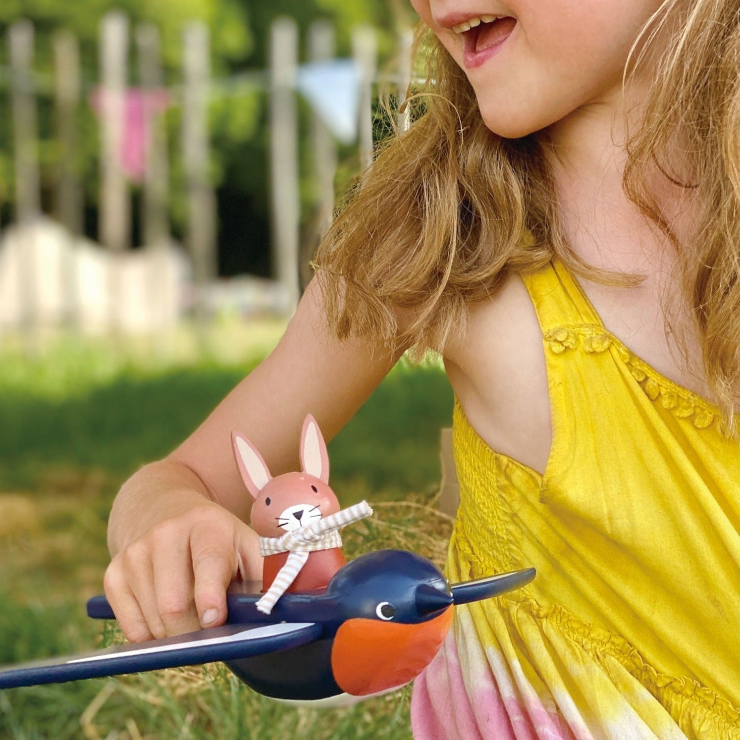 Flying high above our Merrywood village is Spud the pilot Hare, carried by his best friend Swifty the Swallow. The little Hare is removable and has a fabric scarf and his name written underneath.