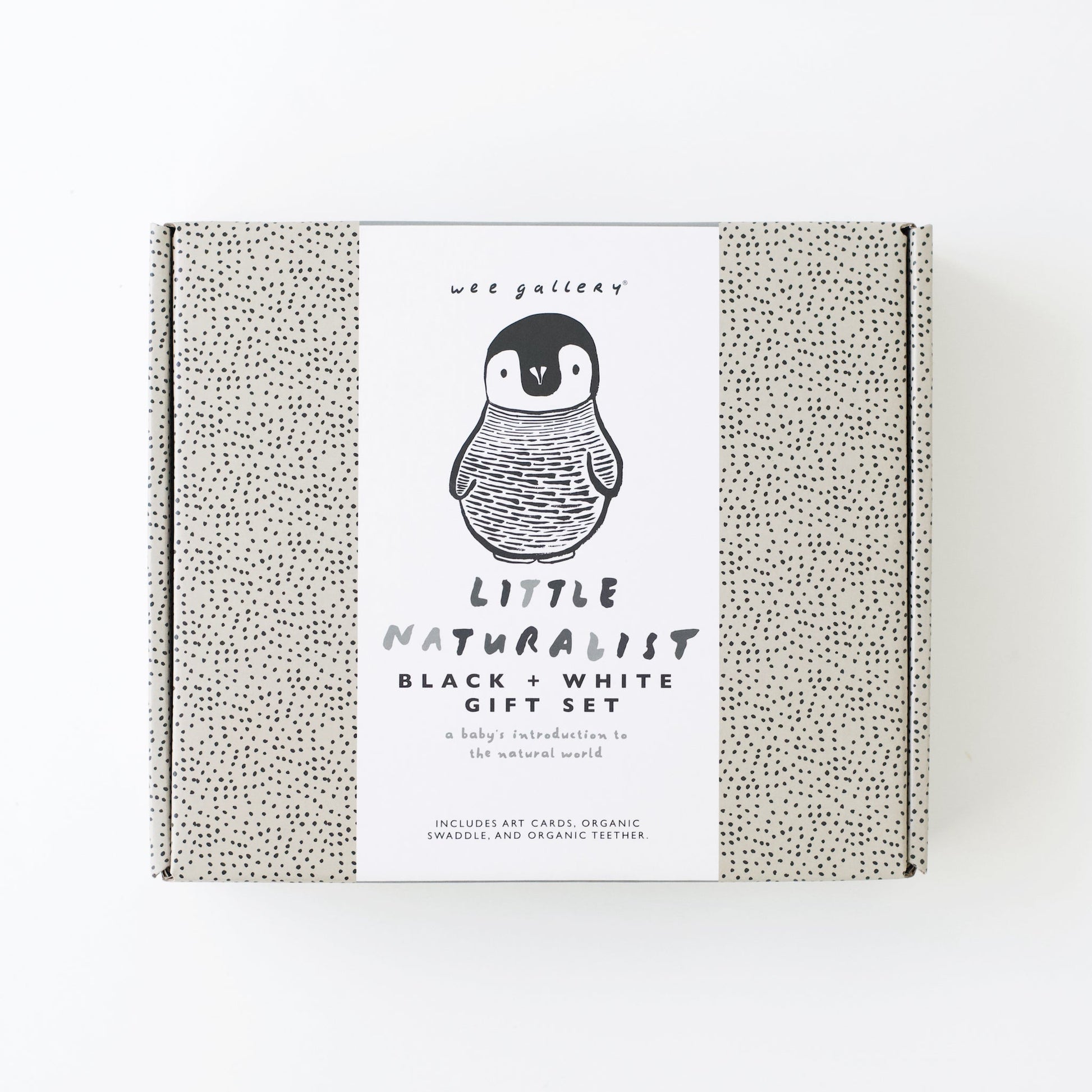 The sets are ready to be gifted in a lovely Wee Gallery box. This set features an Organic Panda Teether, Black & White Collection Art Cards and a Zebra Organic Muslin Swaddle