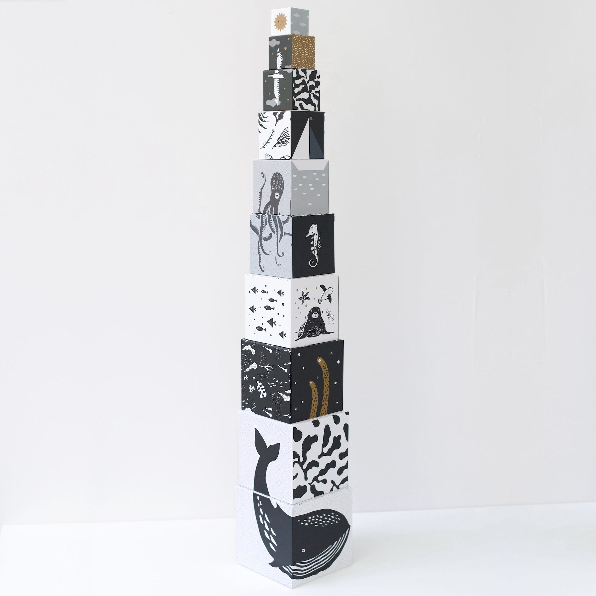 Ocean Nesting Blocks: Made of FSC certified sturdy board. Keep away from water. Can be wiped clean with a lightly damp cloth.