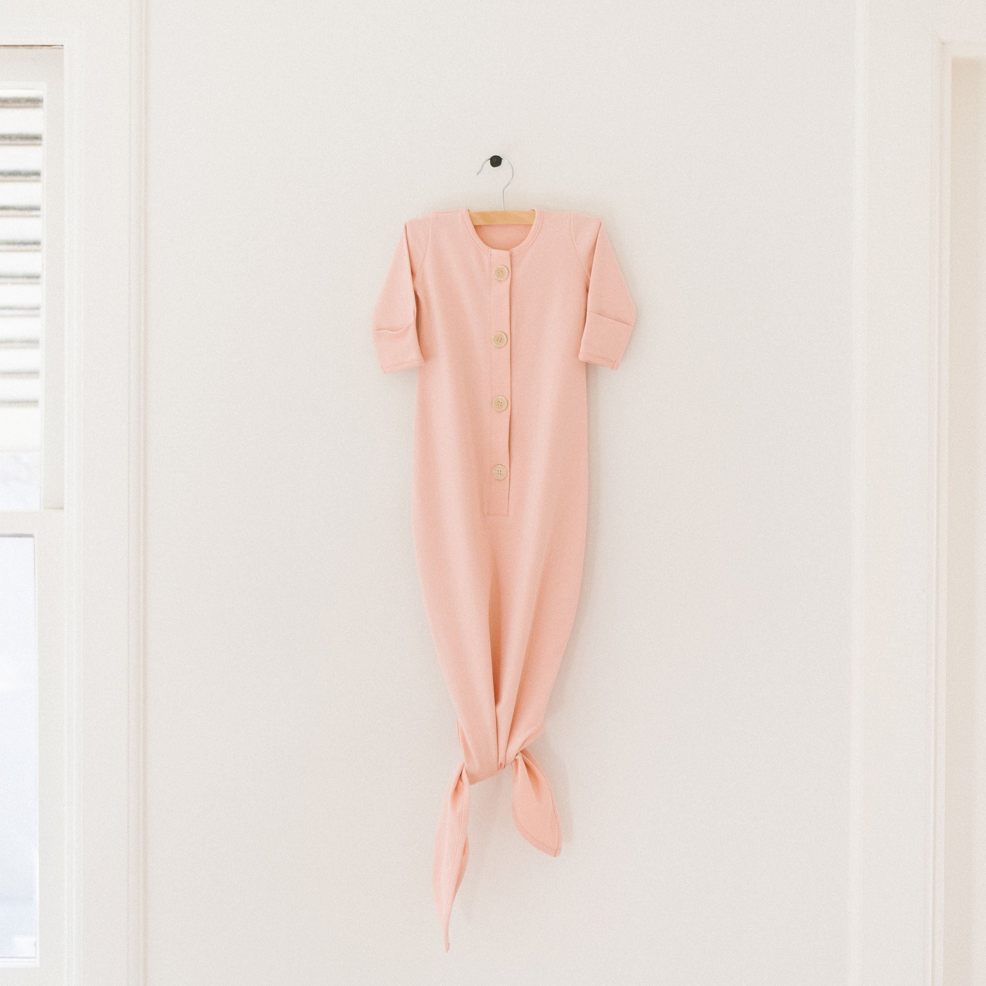 This popular knotted sleeping gown is made with super soft Organic fabric and faux wooden buttons. Light weight with knotted bottom for easy night time nappy changes. Wide enough to enable the baby to sleep in a correct hip position. Features cuff fold over mittens to prevent scratching, and full front opening featuring organic olive tree buttons.