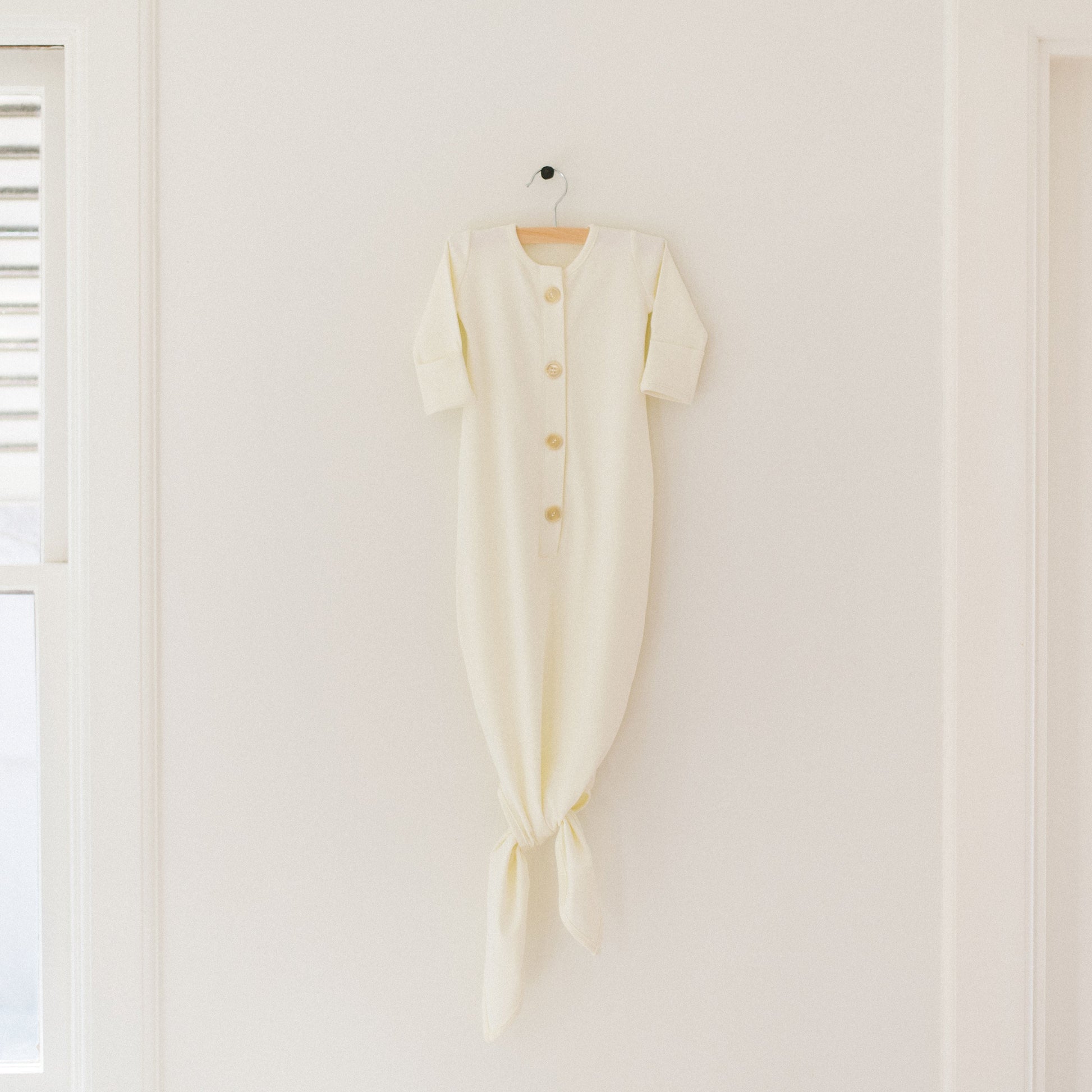 This popular knotted sleeping gown is made with super soft Organic fabric and faux wooden buttons. Light weight with knotted bottom for easy night time nappy changes. Wide enough to enable the baby to sleep in a correct hip position. Features cuff fold over mittens to prevent scratching, and full front opening featuring organic olive tree buttons.