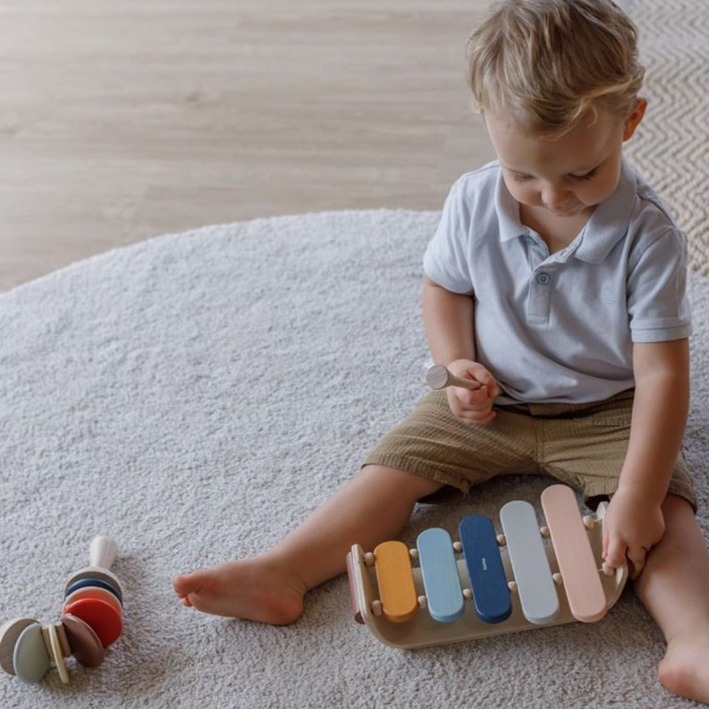 This wooden xylophone features five colorful panels that help with hand-eye coordination. Please note this xylophone is made for fun and may not be musically accurate.