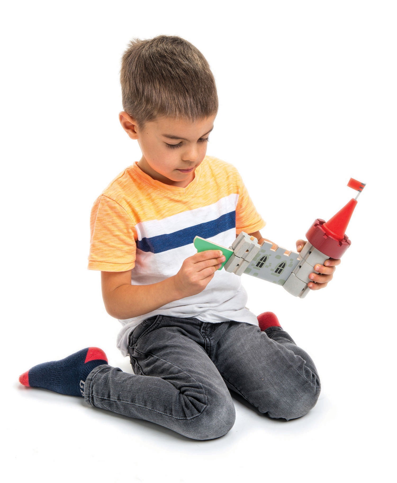 Be the king of Royal Castle! The Magnificent Royal Castle features red and blue soldiers with different postures, heraldic shields and spears, 2 jousting tents, horses to sit on, trees, a fire dragon and a working trebuchet. This comprehensive and luxury size set has all you need to create and build your own unique castle layout, by clipping together walls and posts with small neat plastic pegs.