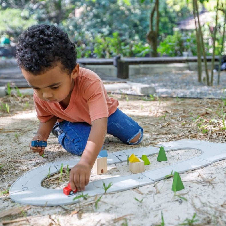 Pave your own path and go on a journey with the Rubber Road & Rail set! The flexibility of the rubber allows kids to create unique city infrastructure for play. This set comes complete with 11 pieces of two-sided rubber tracks, 2 cars, 3 buildings (2 pieces each), and 3 bushes. (22 pieces in total)