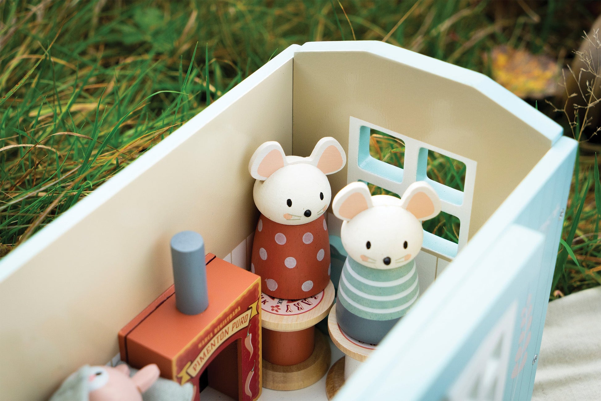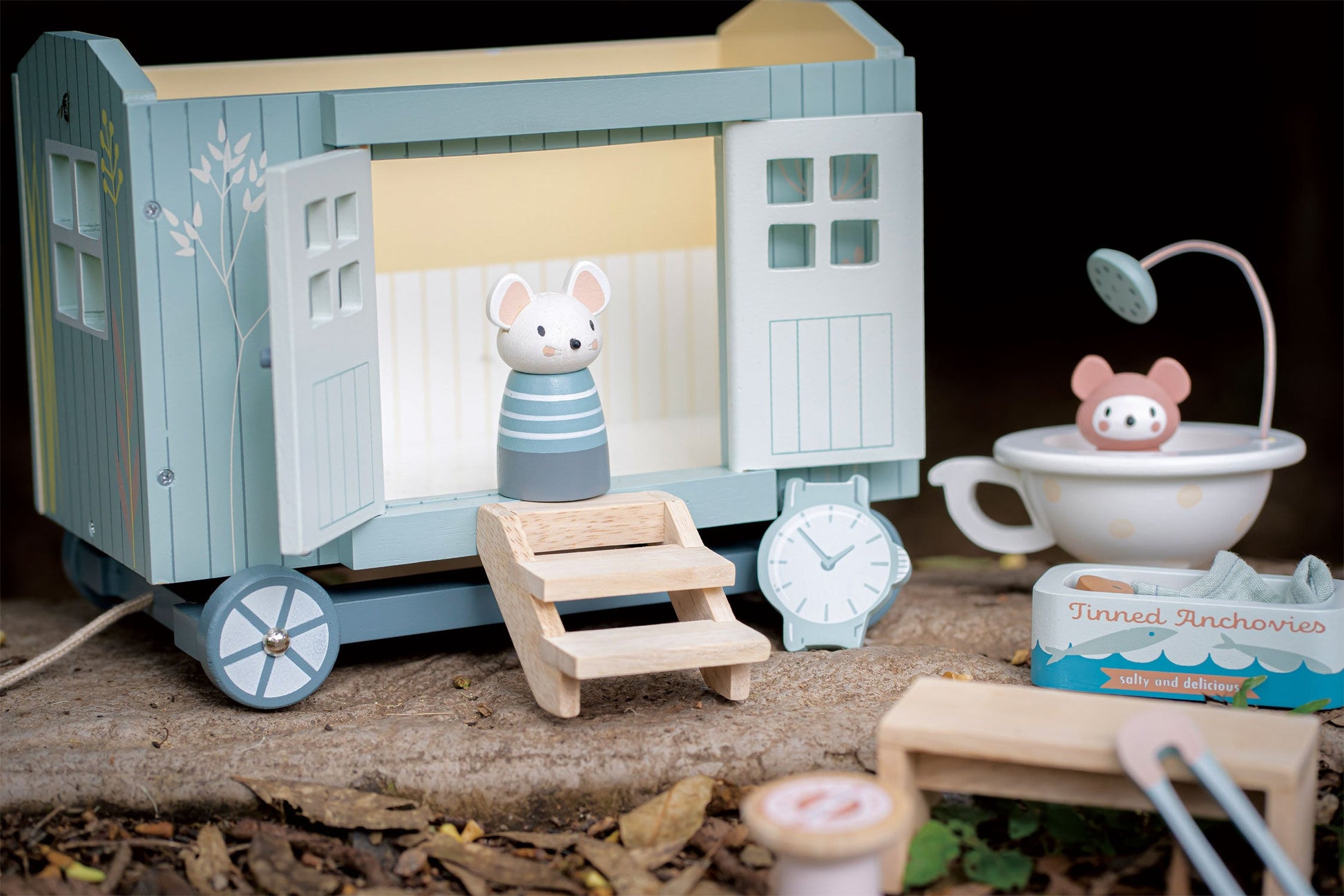 A wonderful addition to our Merrywood Tales collection. This shepherd’s hut is the perfect glamping staycation for our new family of mice. They have borrowed some human-sized trinkets to use as essential furniture in their hut. A teacup makes