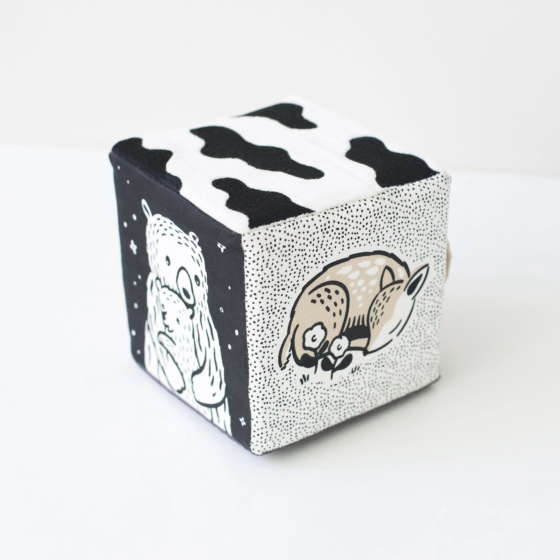 Bears, lambs, and a silly bunny! So much to do and see in one large block. This soft fabric block is designed to delight baby's developing senses with high-contrast graphics, textures, taggies, and crinkles. Featuring multiple scenes and patterns of the world of baby animals.