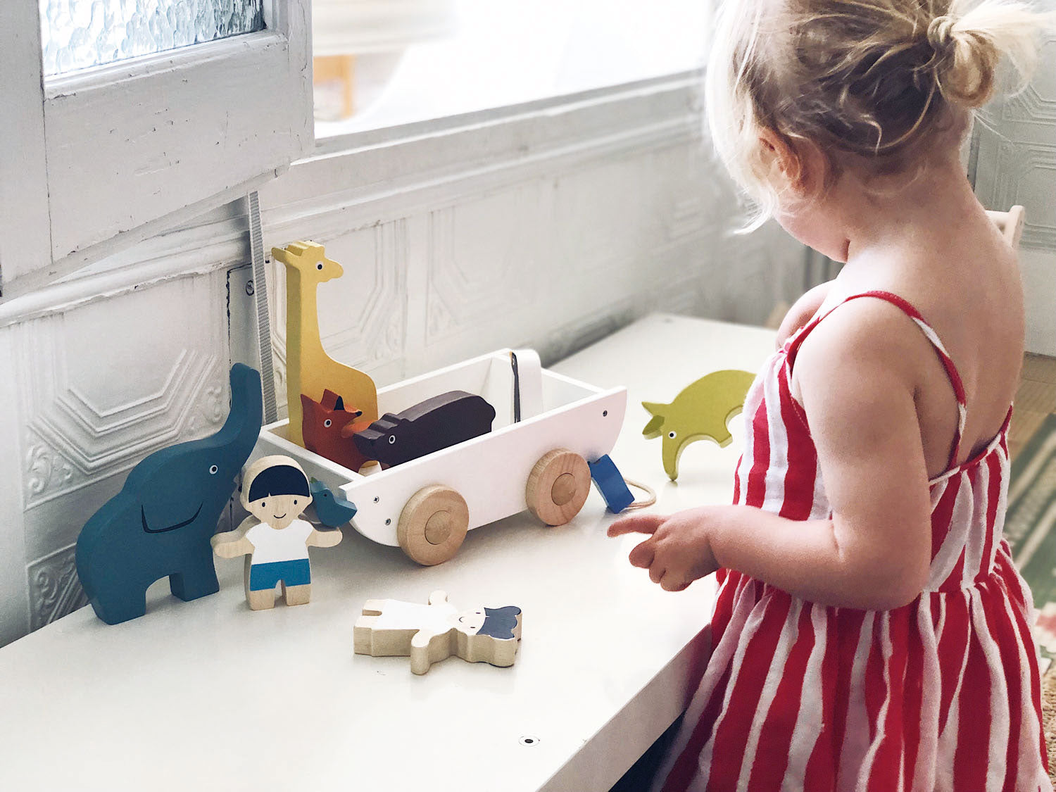 All aboard the Friend Ship! A perfect gift for any toddler, this set is made from sustainable rubber wood and is painted in soft contemporary colors. The set of animals feature, and elephant, Giraffe, Anteater, Whale, Fox, penguin, Bear and a little boy and girl each carrying a small mouse and bird. Pull them along in their cute white boat with natural wood wheels.