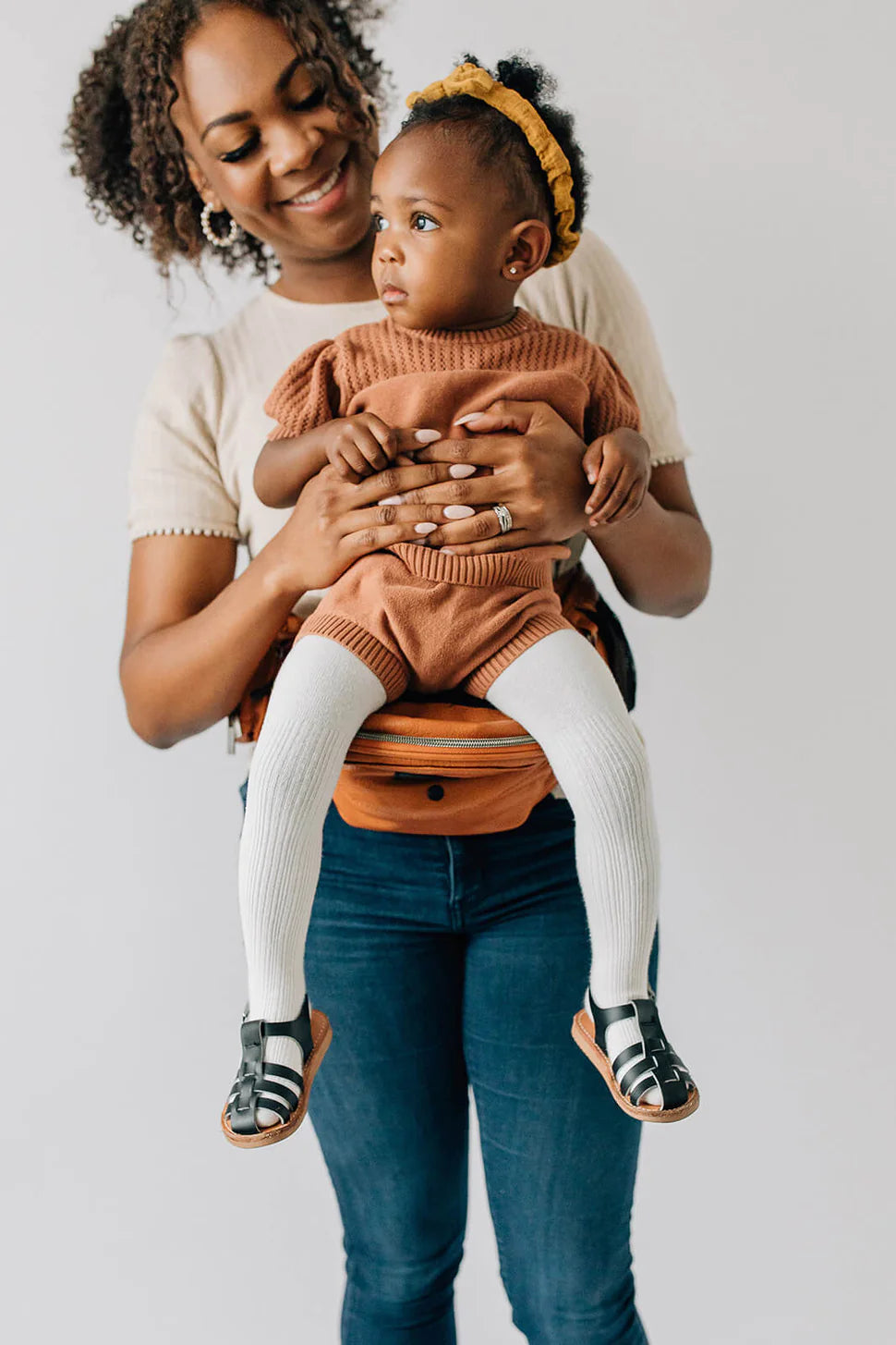 Because it sits high and tight above your hips, Tushbaby protects those muscles, joints, and bones by supporting your back (and your baby) with its built-in lumbar support and ergonomic design. The seat evenly distributes your baby’s weight across your hips, while the waistband allows you to remain upright ache-free.