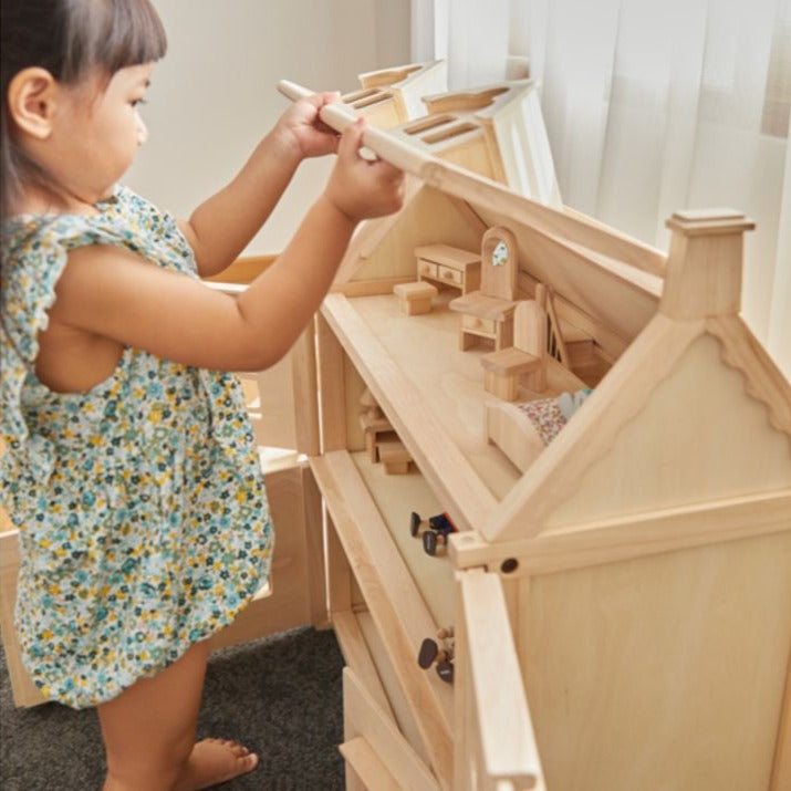 - The most popular PlanToys dollhouse available with 3 floors (including an attic), opening panels and functional sashes that slide open and shut