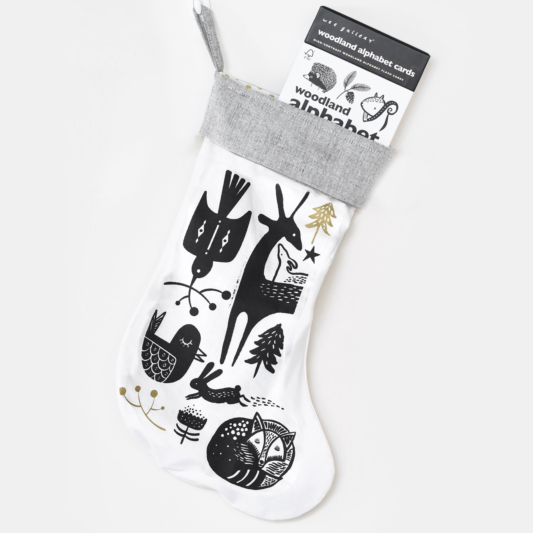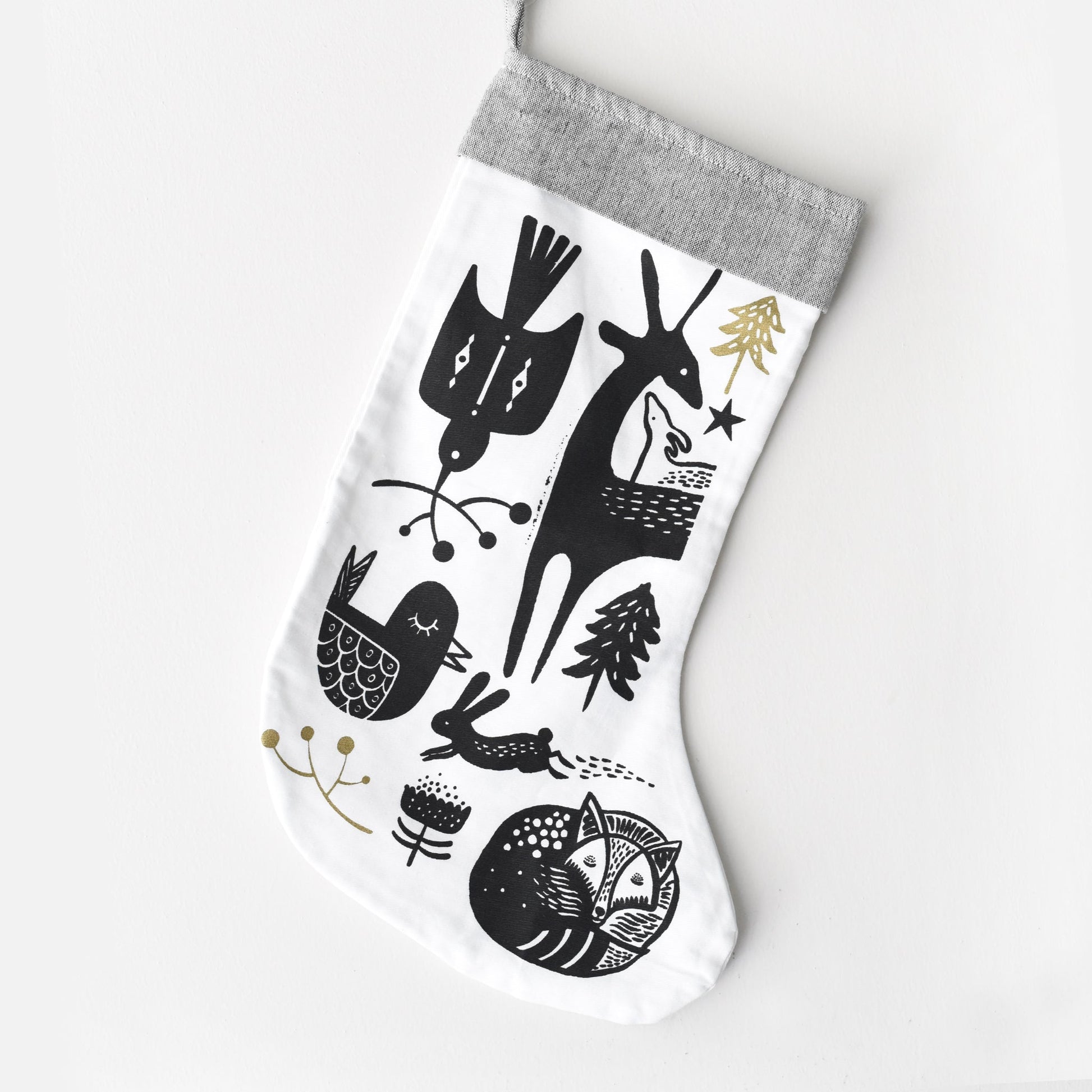This Christmas stocking will give a touch of Wee Gallery to your baby's holiday season. Winter animals printed in black on white 100% organic cotton twill with gold highlights. The inner layer of the stocking is printed with golden dots. Grey band at the top with sturdy loop for hanging. Made in India using ethical manufacturing practices.